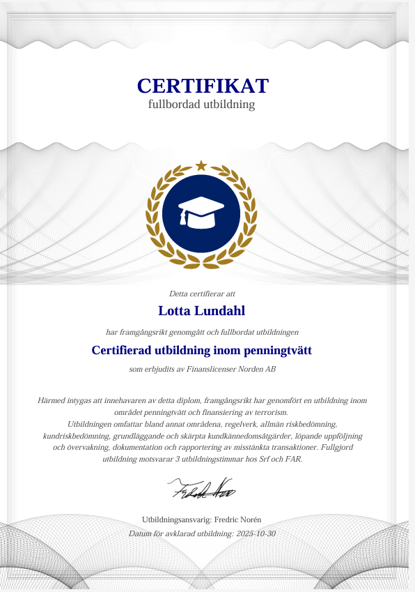 Jag har en Fil. Mag. i Ekonomi vid Uppsala universitet och har arbetat med bokföring i över 25 år. Jag har en gedigen erfarenhet från byggbranschen. Stor vana av att arbeta i olika program, tex Spiris (fd Visma) , Kontek och Fortnox. Nu vill jag hjälpa små- och medelstora företag att få en enkel hantering av ekonomin.